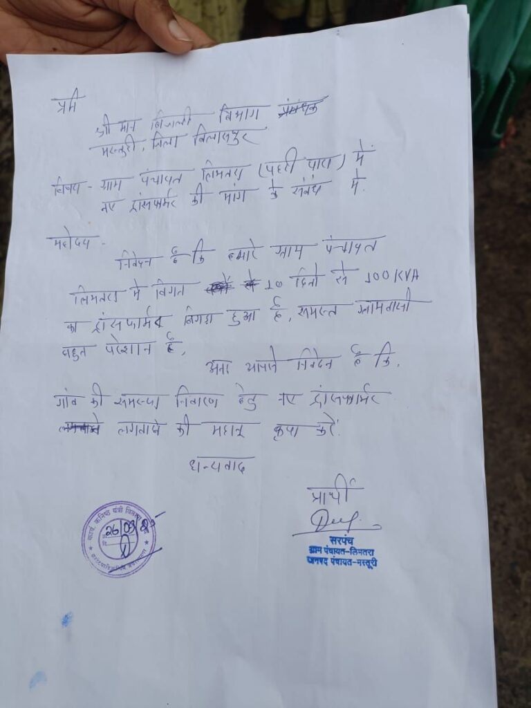 इन्हीं परेशानी से तंग आकर ग्राम पंचायत लिमतरा के सरपंच दीपचंद वस्त्रकार और ग्रामीणों ने आज मस्तूरी बिजली कार्यालय जाकर ज्ञापन सौंपा। इस दौरान सरपंच दीपचंद वस्त्रकार और ग्रामीणों ने मांग की कि जल्द से जल्द नए ट्रांसफार्मर लगाया जाए, ताकि पानी और खेती की समस्या का समाधान हो सके।